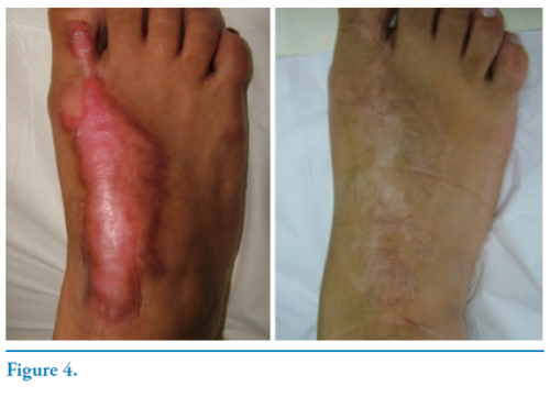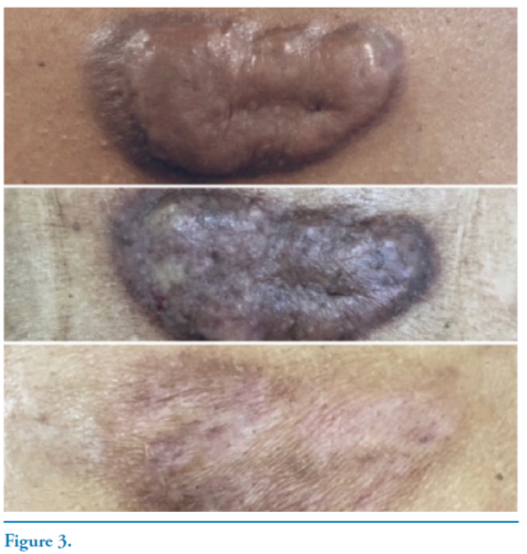 The first algorithm letter A stands for ASSESSMENT before starting any treatments (A.S.A.P). Among patients with K and HS, post trauma, surgery and burns, some of those have recurrent lesions; and others are dissatisfied with atrophic scars after the K/HS resolution, with striae, telangiectasias, atrophy, skin/scar discoloration, led by premature corticosteroid injection or topical occlusive corticosteroids. The second step is S- SOFTEN THE SCAR BEFORE INJECTIONS- A.S.A.P. We have previously shown that scars treated with occlusive dressings improve Vancouver Scar Scale parameters and reduce intra-scar pressure, facilitating intralesional injections, especially when combined with pressure garments. We customize hand-crafted garment devices in different models to suit patient´s needs. On the third algorithm step, A- APPROACH WITH INJECTIONS AND TECHNOLOGIES- A.S.A.P., different combinations of steroids and antineoplastic drugs are easily injected into the scar tissue. Different technologies such as Intense Pulsed Light, Vascular Dye Lasers, microneedling with drug delivery help improve the Vancouver Scar Parameters. P- A.S.A.P - TREAT PIGMENTATION AND THE QUALITY OF THE SKIN is the last phase of this algorithm. Hyper/hypopigmentation frequently remain once the scar or keloid has improved height, erythema and pliability. That´s when we start the last phase of our protocol, focusing on improving the quality of the skin, as well as the mixed pigmentation, allowing for a more natural resulting scar. Topical drugs, chemical peelings and microneedling are then combined with fractional and nonfractional lasers to achieve a more uniform scar color. Autologous melanocytes transplantation and fat grafting may also be used in this final phase.
